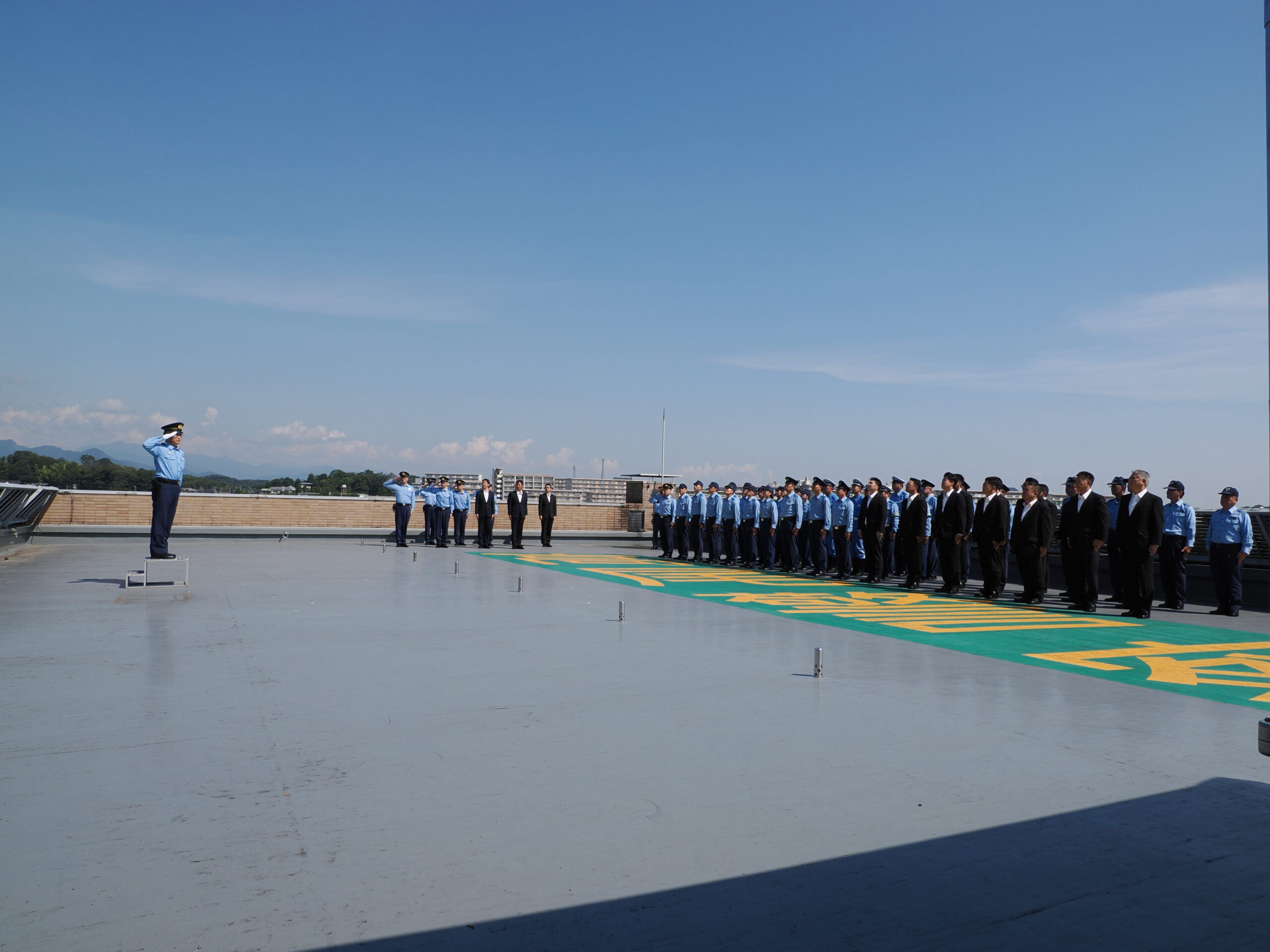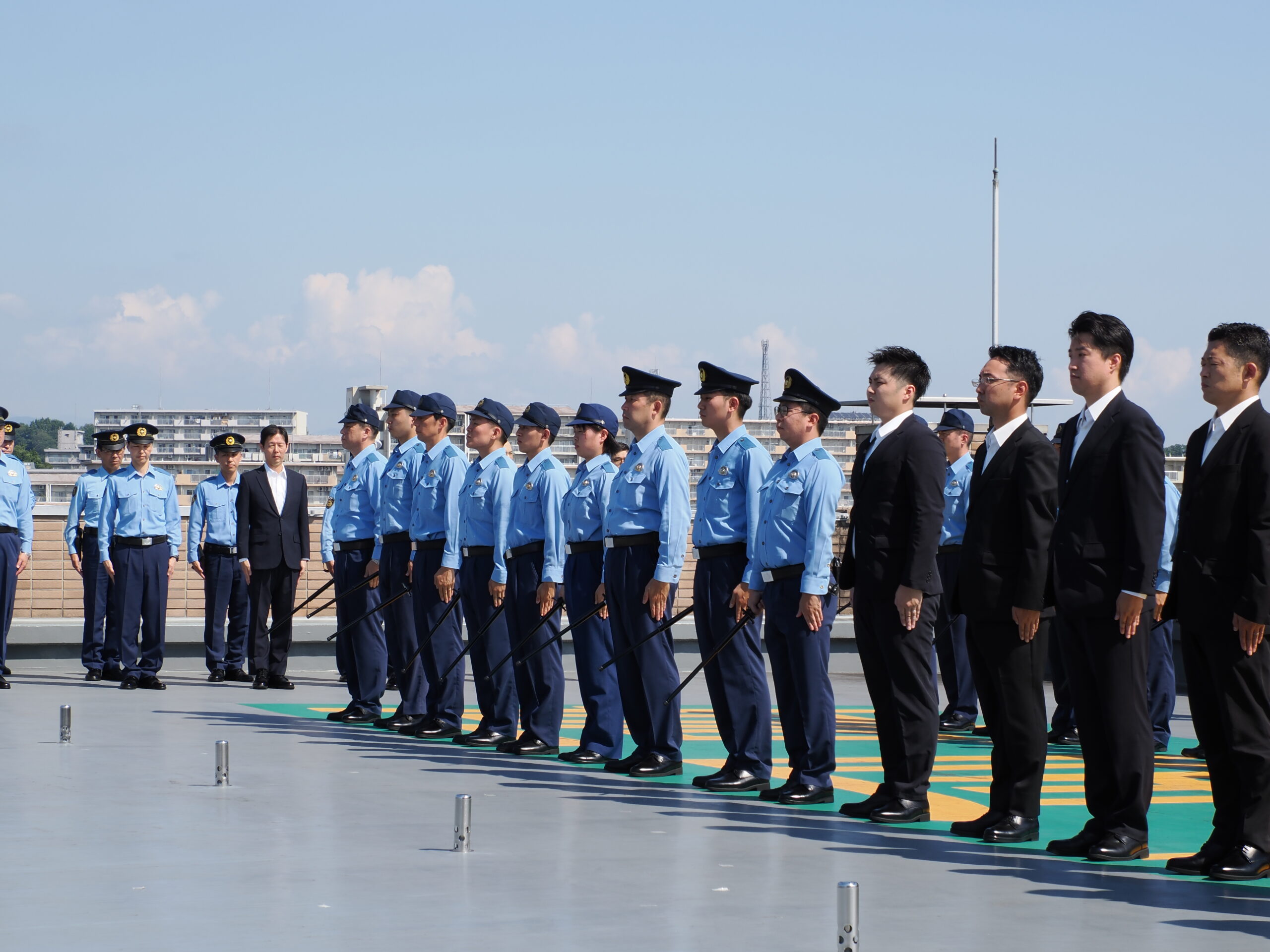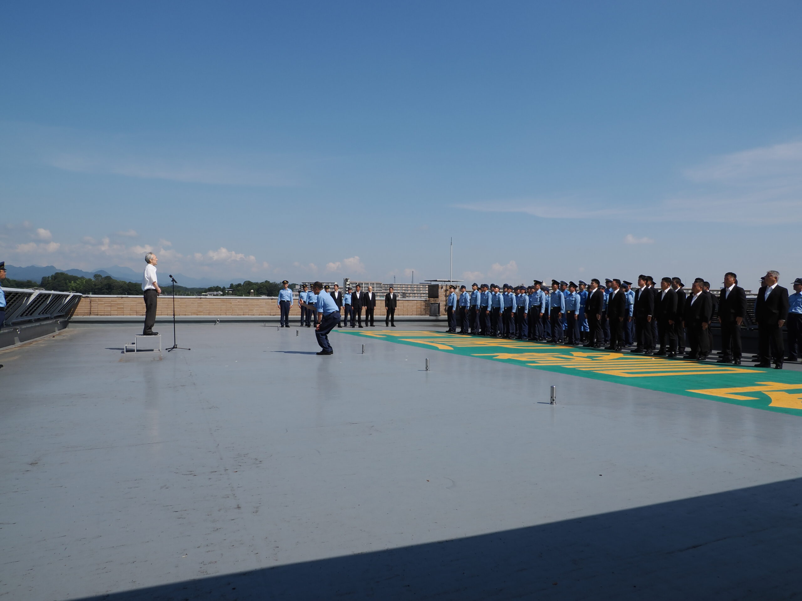高尾警察署の朝の点呼に参加 2025/07/22 令和7年7月22日火曜日 田部井署長より、高尾警察署の朝の点呼に参加して、署員を激励してほしいとのご案内を頂いたので、 田中会長・山田副会長・石堂副会長の3名で伺いました。