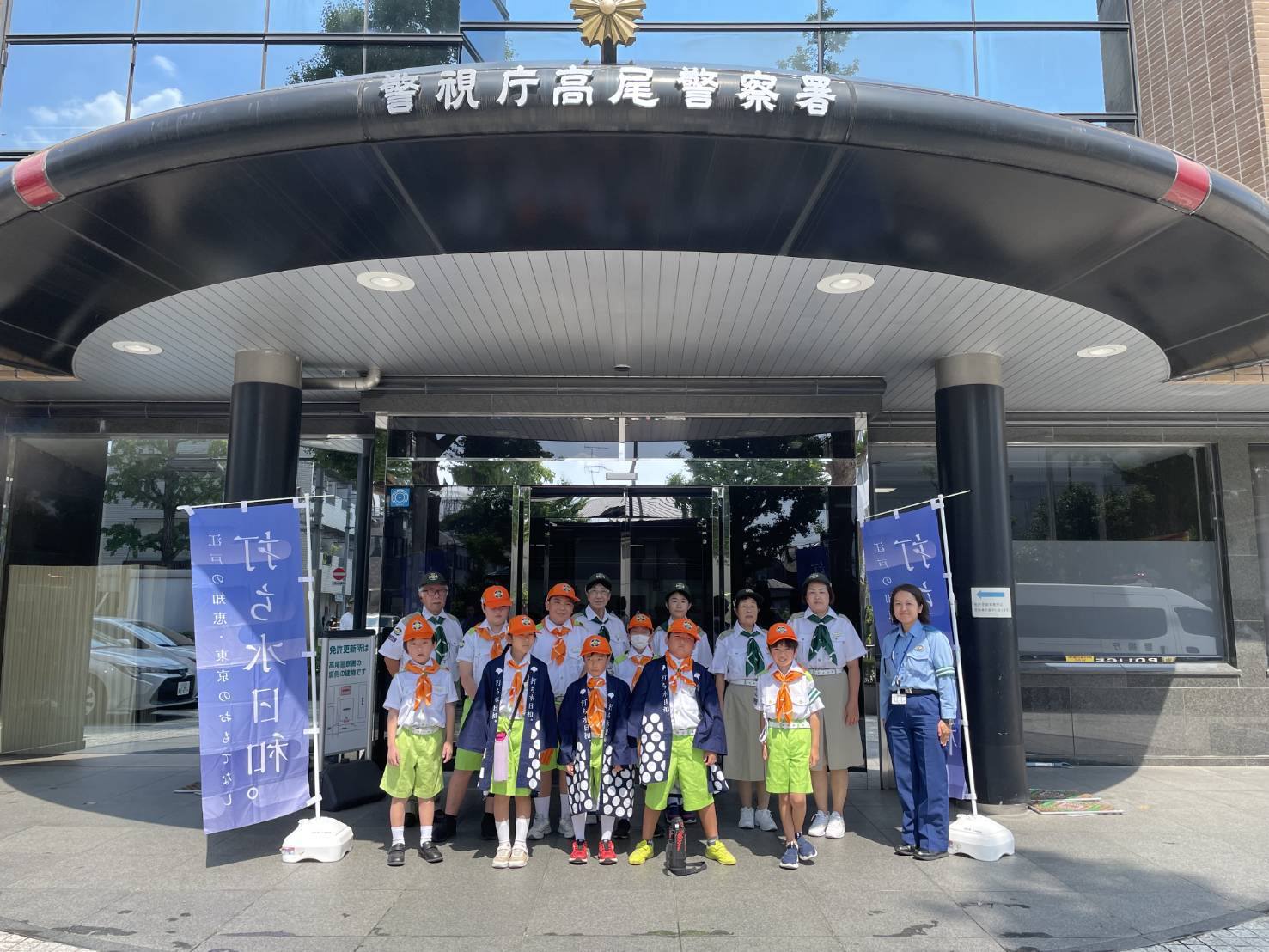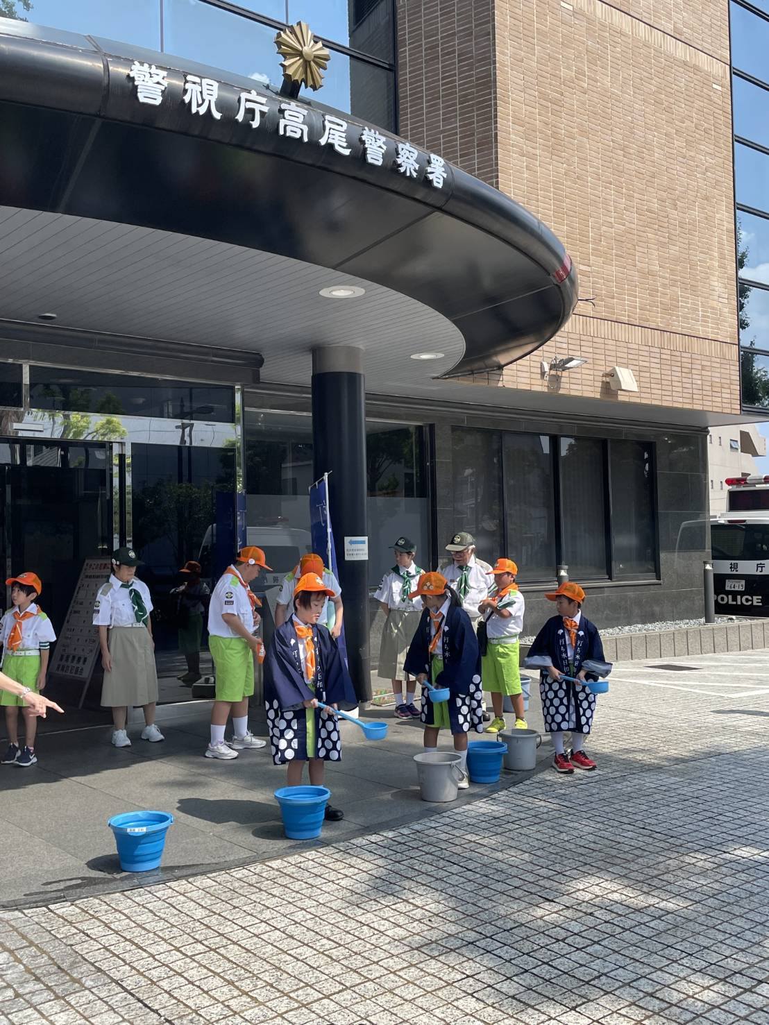 打ち水 2025/08/26 8月24日日曜日、交通少年団のメンバーが高尾署の玄関前に打ち水を実施しました。 酷暑の中、ひとときの涼となりました。 その後、土手等にて市民の皆様に交通安全グッズを配布し、啓蒙活動を実施しました。