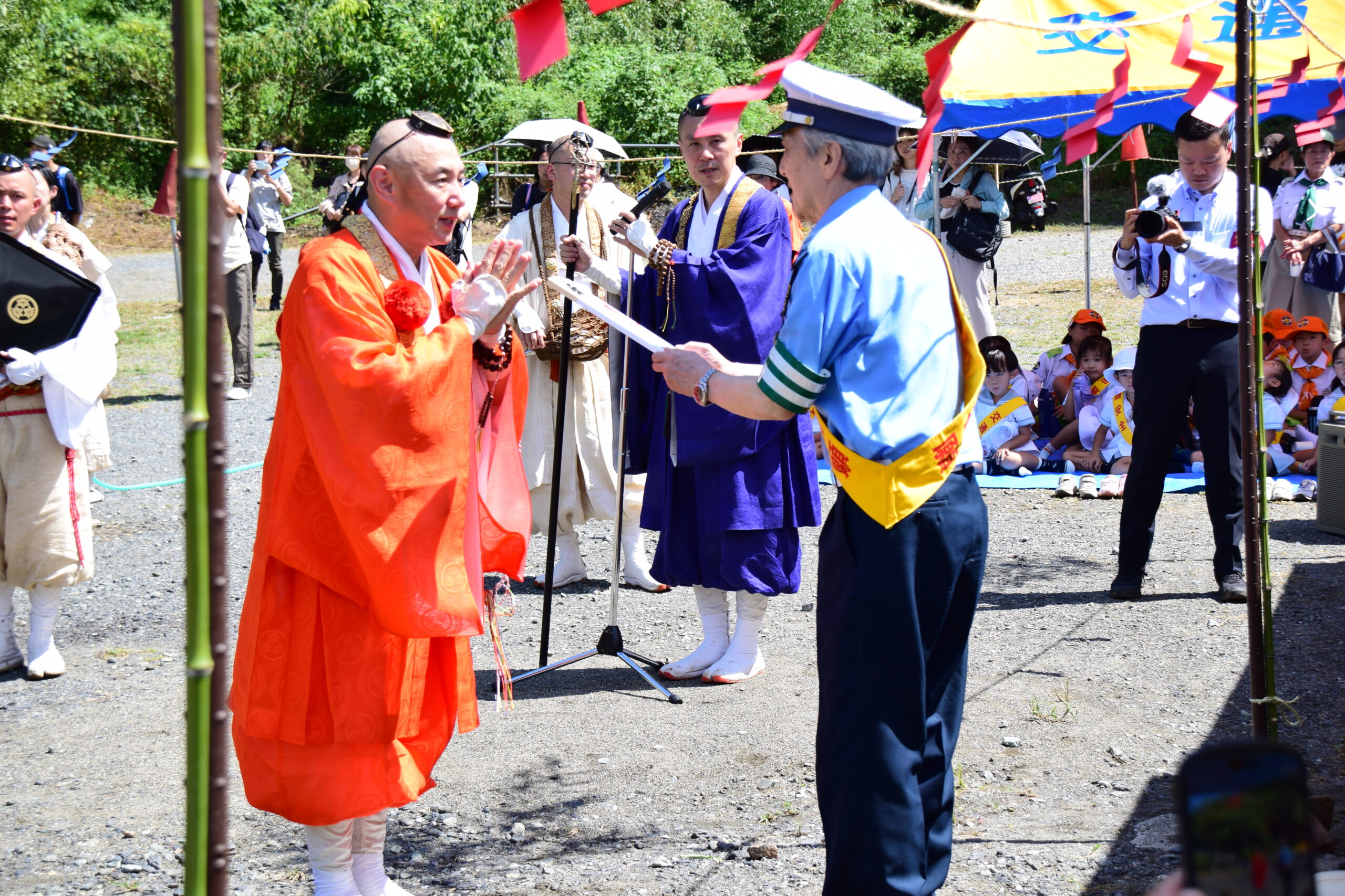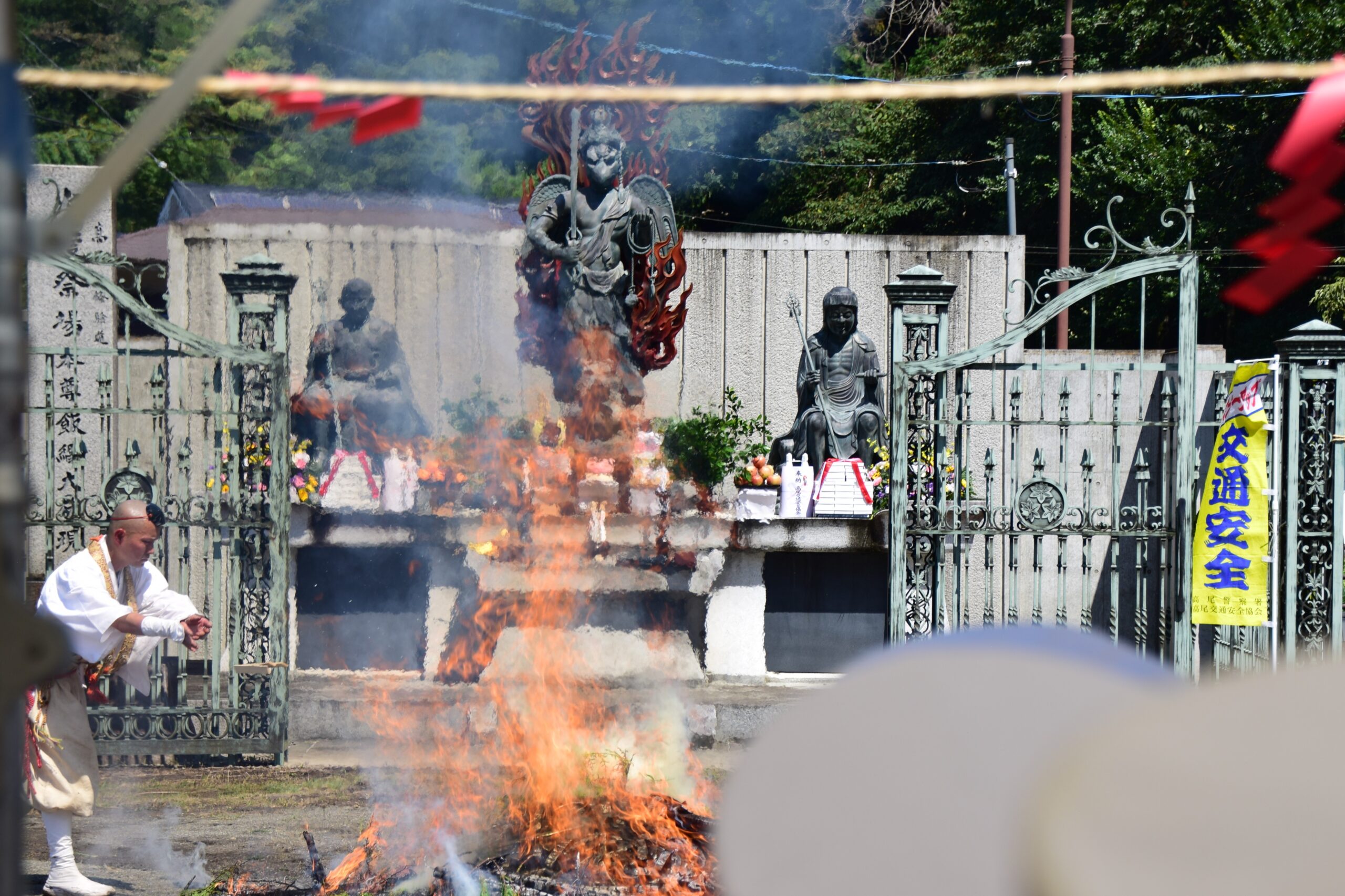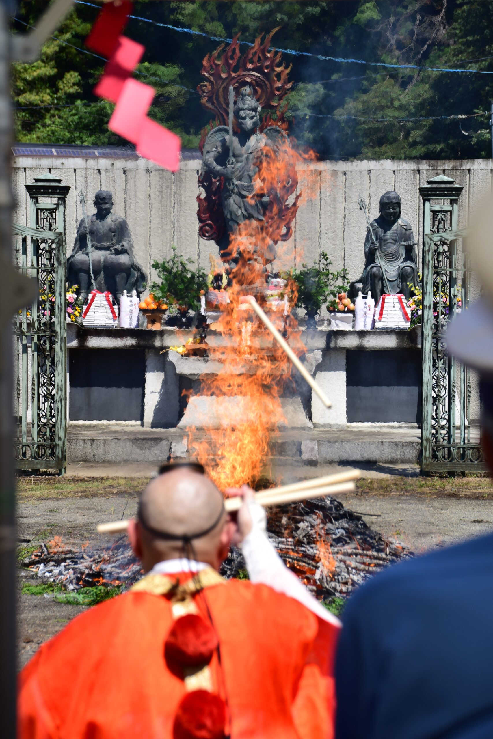 その後、駐車場では柴燈護摩を挙行し、皆様からお預かりしたなで木を火中に投じ、交通安全祈願をいたしました。